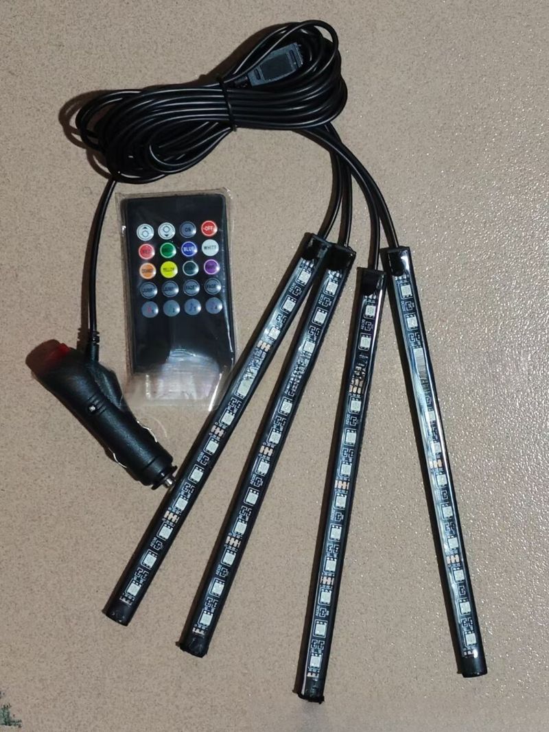 OPP bag packaging (please contact customer service if you need a box) Product name: One-to-four voice-controlled atmosphere light 5050-12smd 12V Material: Silicone Voltage: DC12V Number of light strips: 4 LED quantity: 12 LEDs per strip LED type: 5050SMD Light Color: White Red Blue Green Ice Blue Orange Yellow Pink Purple Pink Remote control: 1 piece Remote control battery: 1 CR2025 Product Color: RGB Product size: 14*220mm Power: 10W Cable length: 1.5M*2 2M*2 Net weight: 215g (packed in OPP bags) Irradiation angle: 180 degrees wide-angle irradiation Applicable socket: with cigarette lighter socket, no need to modify the circuit. Control functions: 4 music control modes, 8 signal color controls, brightness control (only for white), ON/OFF, 2-segment jump mode control, fade in/fade out 2-mode control - Wireless Music Control 7 Colors RGB Car Interior Lights Kit. - High quality RGB LED strip light. - Wireless infrared control, you want to change the color. - Also with music control mode, make your car more attractive. - Control modes: 4 music control modes, 8 signal color controls, brightness control, ON/OFF, 2-segment jump mode control, fade in/fade out 2-mode control. - Application: Suitable for illuminating the entire car interior, the product comes with a cigarette lighter socket, plug and play, no modification required. - Note: Brightness control only applies to WhiteLED.