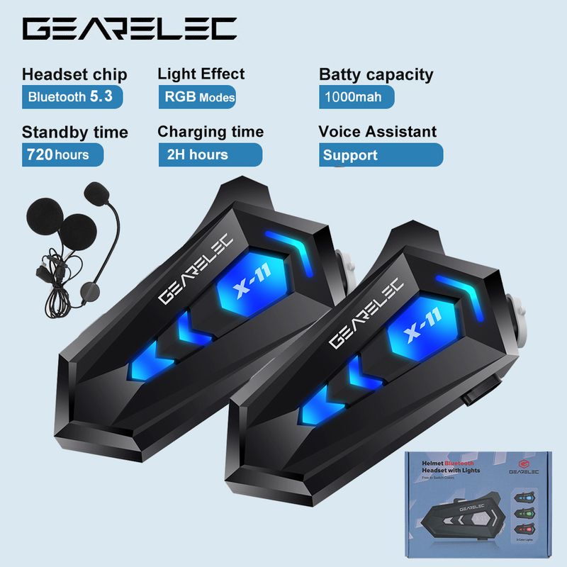 GEARELEC X11 Motorcycle Bluetooth Helmet Headset Hands Free Call IPX6 Waterproof 1000mAh Headset Speakers HiFi Stereo RGB Light Features: 【Multifunctional helmet intercom headset】X-11 allows you to make hands-free calls, enjoy the use of streaming music, listen to GPS voice guidance convenient intercom and Voice-activated digital assistant access, allowing you to enjoy the ride safely and happily. 【Hi-Fi Stereo and CVC Noise Control】Premium HiFi stereo speakers for clear audio and sound quality on music and phone calls,Features advanced CVC Noise cancellation technology to reduce background noise,Ensure that you can still let the other party hear your voice clearly when driving at high speed. 【IPX6 waterproof and Playback Control】IPX6 waterproof design help you handle all weather conditions, you can use the E1 motorcycle communication systems in rainy day. Easily button control to play/ pause music, previous/next song, switch music to intercom, adjust volume, reject or answer calls. 【Longer Battery Life 】Up to 12 of hours music/talk time, and 720 hours of standby time on single charge, to fully charge the headset only 2 hours, make sure you can use it continuously throughout the day.